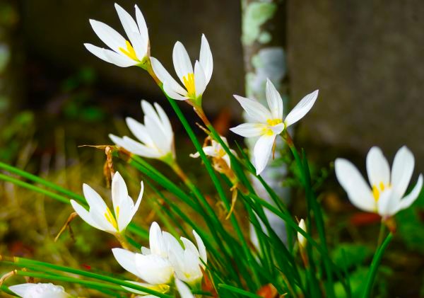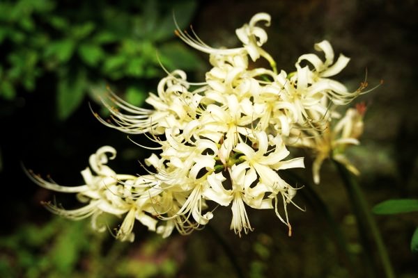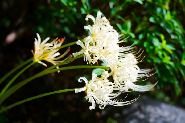 白いヒガンバナは赤花に比べて花びらのカールが控えめで、すっきりとした姿が印象的です。中心からは猫のひげのような細い雄しべが空へ向かって伸び、全体に凛とした美しさがあります。