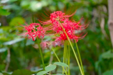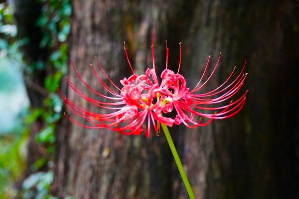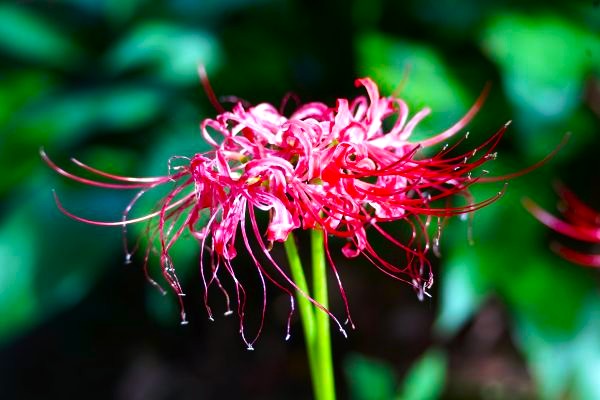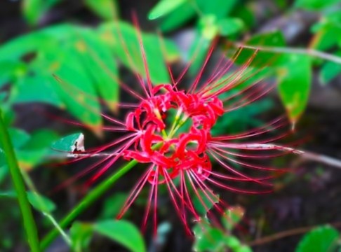 英名では「Red Spider Lily(赤い蜘蛛百合)」と呼ばれ、その名のとおり、細く伸びた花びらや雄しべが、まるで蜘蛛の脚のように広がっています。