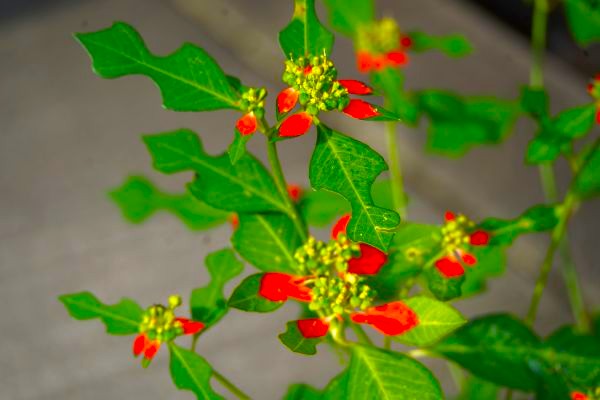 ショウジョウソウ(猩々草) 赤と緑のコントラストが美しく、上部の葉の形はどこかバイオリンを思わせる優雅なシルエットにも見えます。