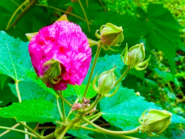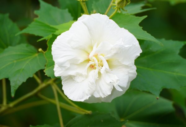 スイフヨウ(酔芙蓉) 朝は白、昼は淡いピンク、夕方には紅色に変わる花の性質から、「お酒に酔ったように色づく芙蓉(ふよう)」という意味で名付けられました。