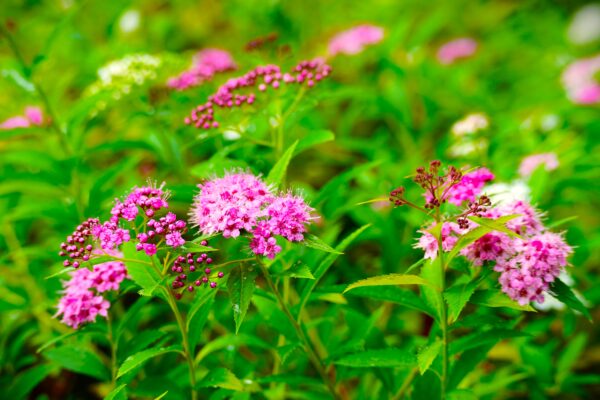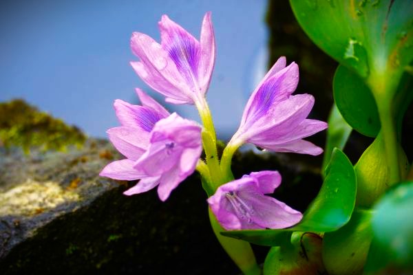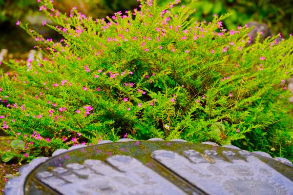 メキシコハナヤナギ 仏足石の背後に広がるのは、まるで扇を開いたように咲き誇るメキシコハナヤナギ。小さな紫の花が枝先にびっしりと咲き風に揺れるさまは、まるで薄絹のような優美さです。