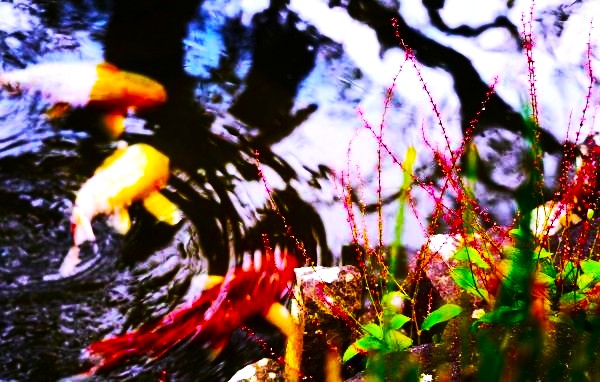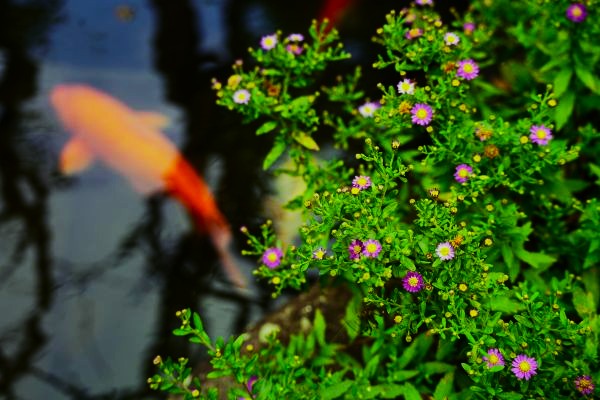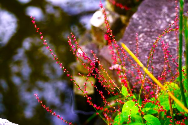 ミズヒキ(水引) 細く揺れる水引の花と、鯉が生むやわらかな波紋。動と静が溶け合うような心落ち着く秋の風景です。