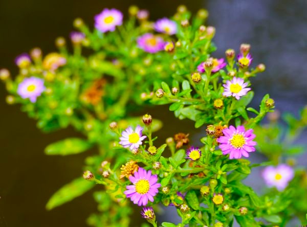 コンギク(紺菊) 小さな紺色の花が密に集まり、落ち着いた色合いで秋の風情を演出します。長く楽しめる秋の代表的な花です。