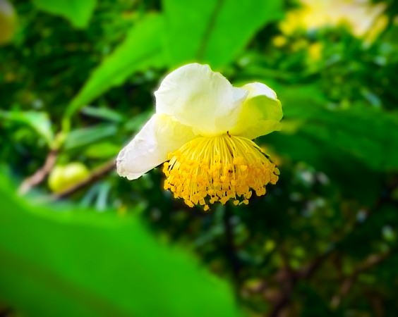 チャノキ(茶の木) 白い花びらと黄色いおしべが鮮やかに映え、その周りを包み込む緑の葉が美しく調和しています。