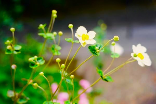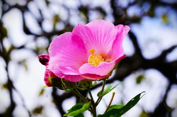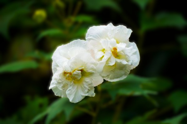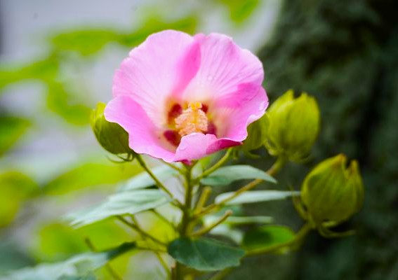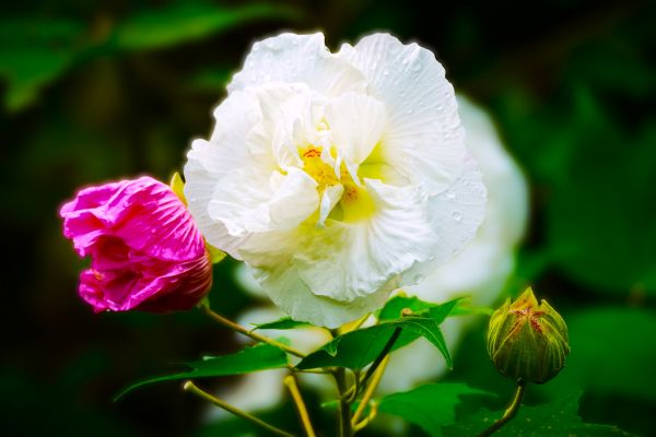 スイフヨウ(酔芙蓉) 咲き始めの蕾、白く見頃を迎えた花、そして淡い紅を帯びた咲き終わりの花が、ひと枝の中に揃い、酔芙蓉の魅力を物語っています。