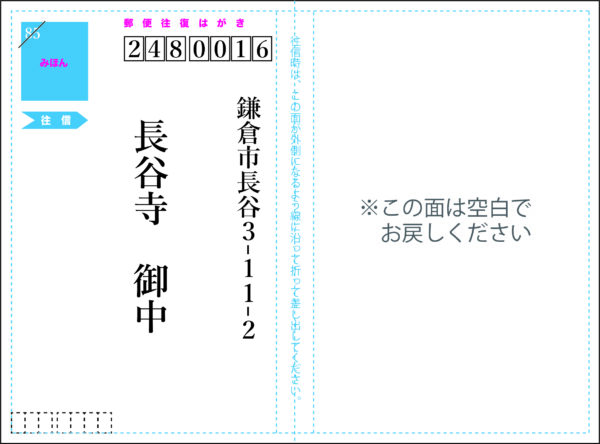 ①官製往復はがきに必要事項をご記入のうえご郵送ください。