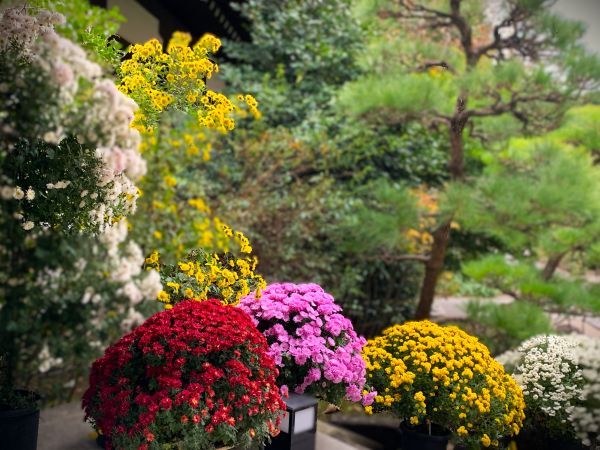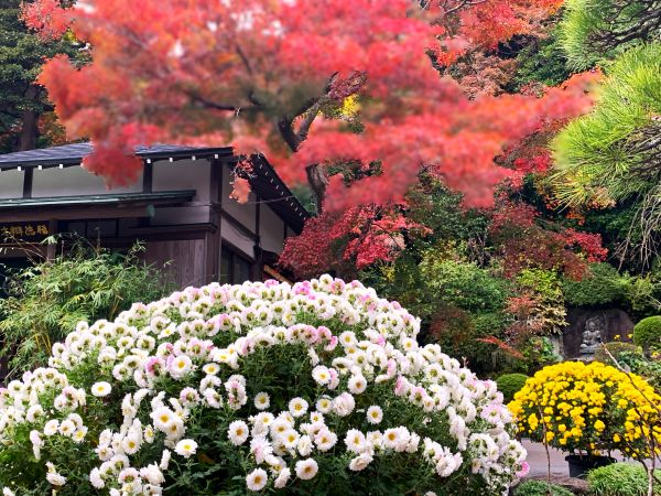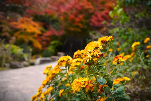 色付く紅葉とまん丸に咲いたざる菊が並ぶ姿は、まるで秋の贈り物のようです。