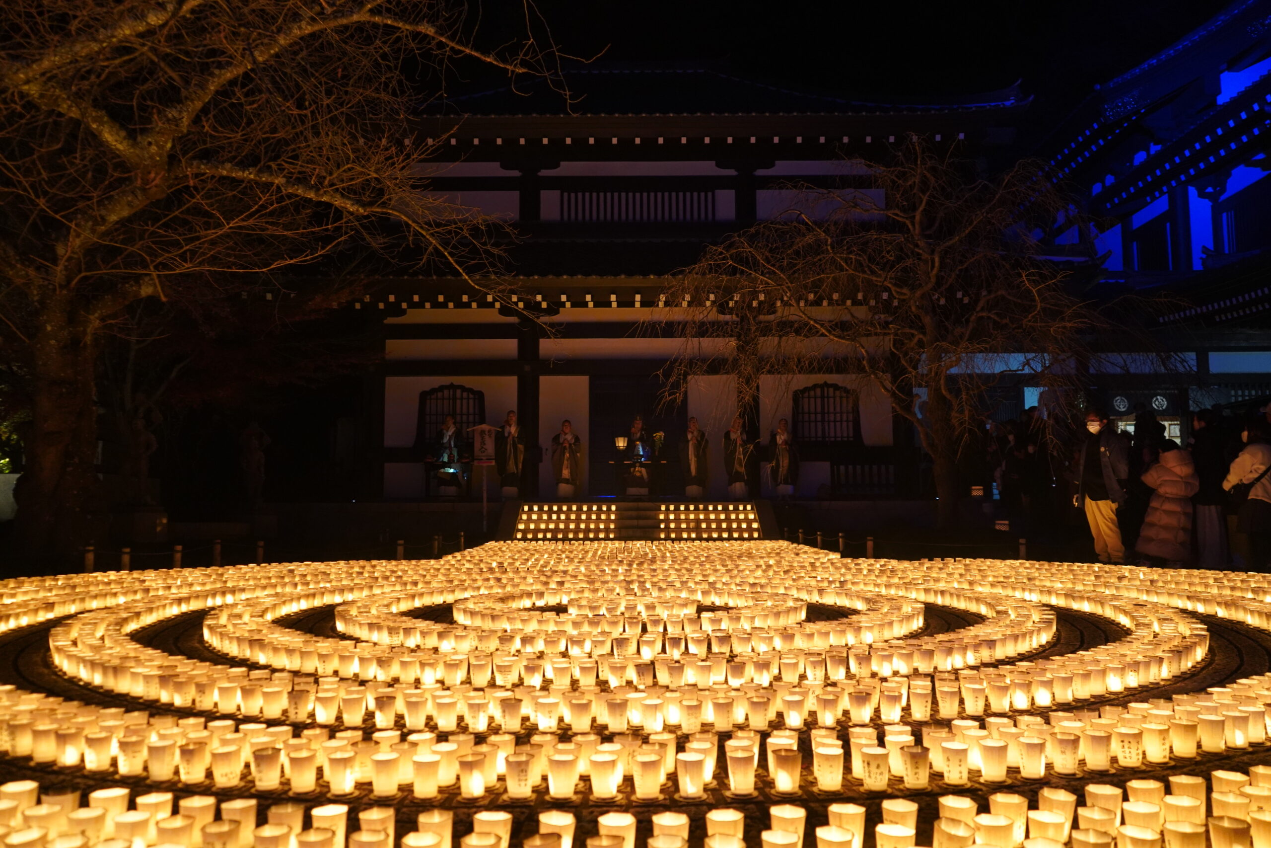 ・修正会の後、僧侶が広場に集い、約6,000個の祈願ローソクの前で読経祈願いたします