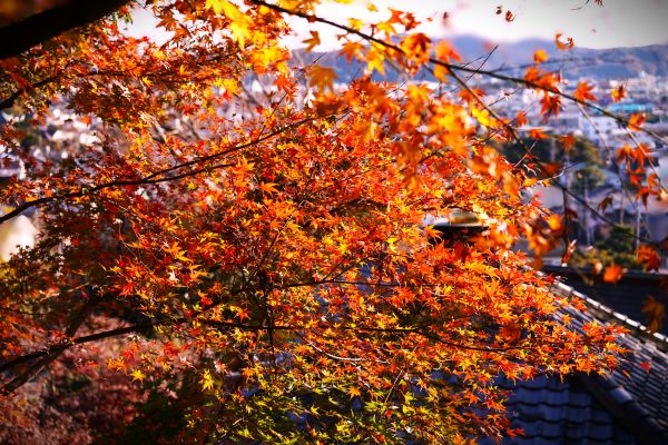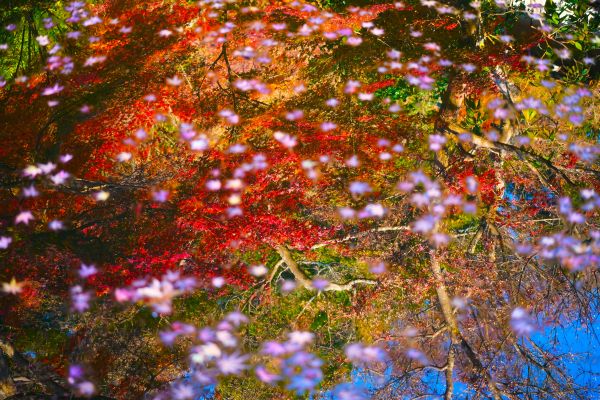長く楽しませてくれた紅葉は役目を終え、今は静かに池の水面を彩っています。輝いた紅葉が優しく池に受け止められる瞬間です。