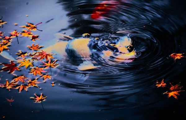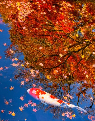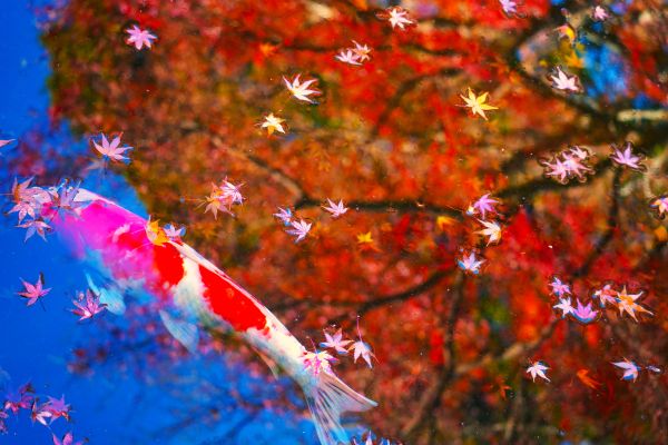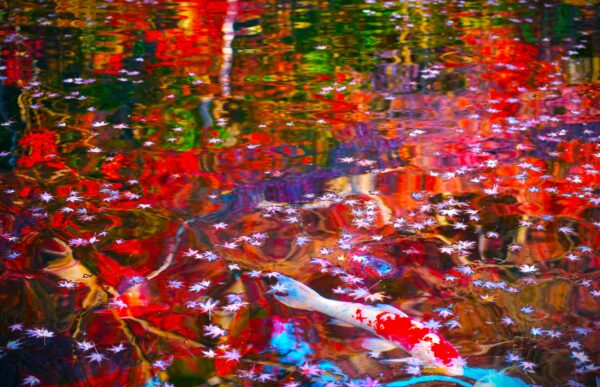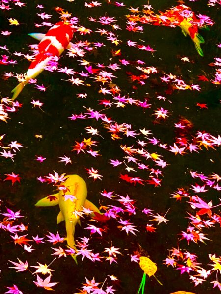 色とりどりの紅葉が水面を彩り、その中を鯉がゆるやかに泳いでいます。秋の余韻が感じられる一枚となりました。