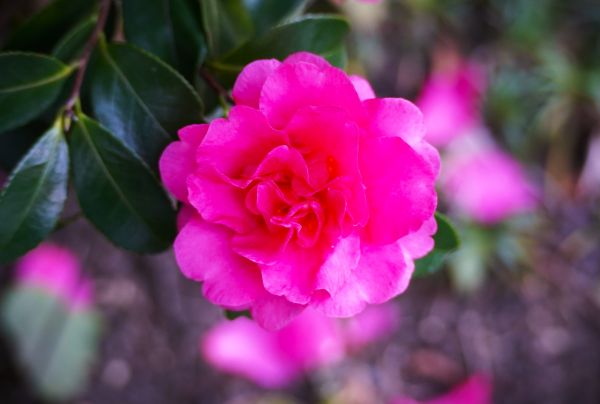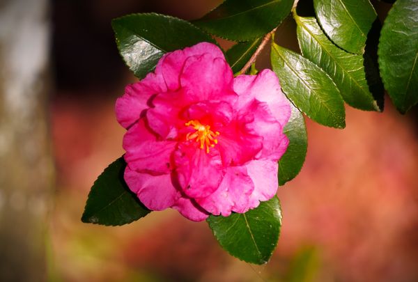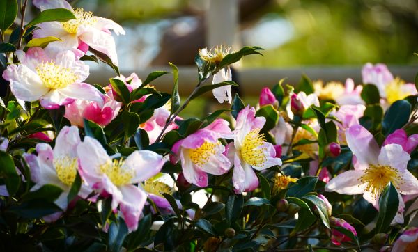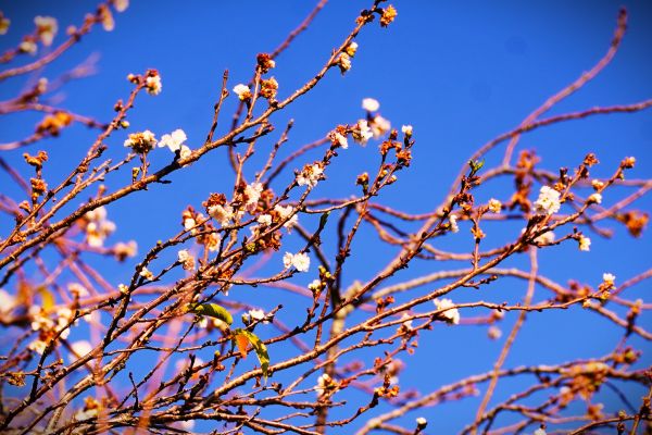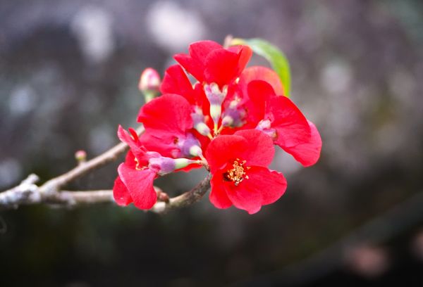 ボケ(木瓜) 枝先にボケがぽつぽつと咲き、境内にささやかな春の気配が漂い始めています。