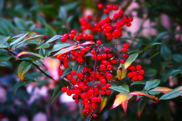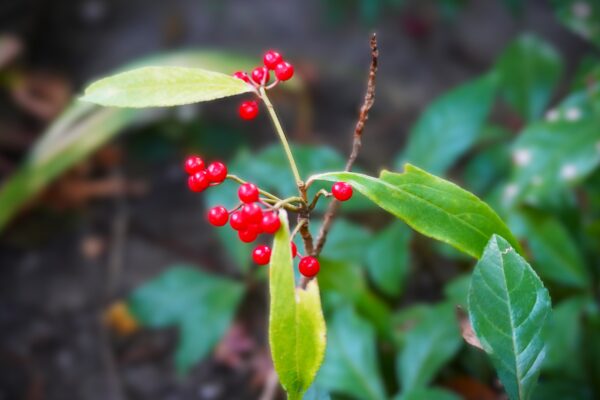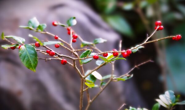 イチリョウ(一両) 一両から万両まで赤い実が境内に点々と実り、縁起の良い冬の景色を作り出しています。