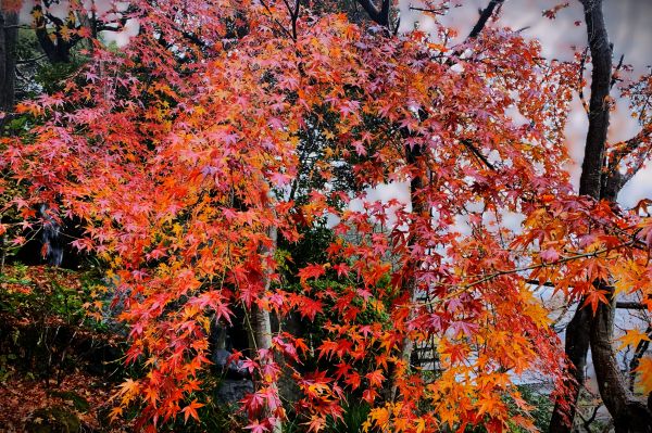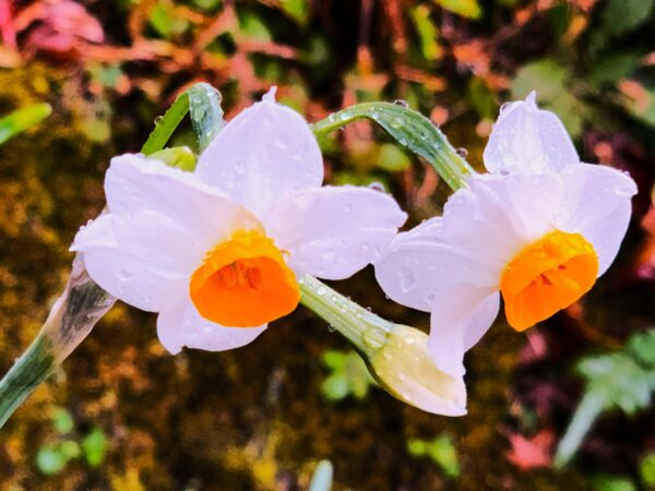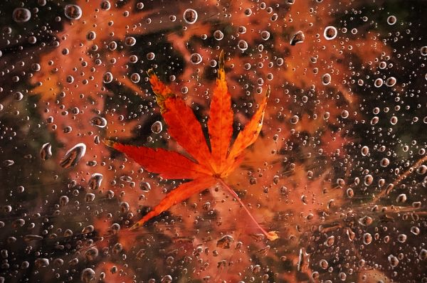秋の名残の紅葉が、ふわりと傘の上に舞い降り、雫に包まれています。まるで秋から冬へ景色が移り変わるバトンを受け取ったかのよう。冬の訪れをそっと告げる儚くも美しい瞬間です。