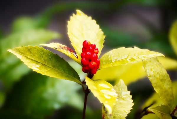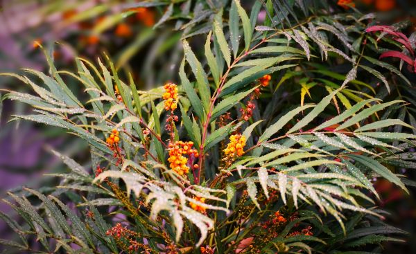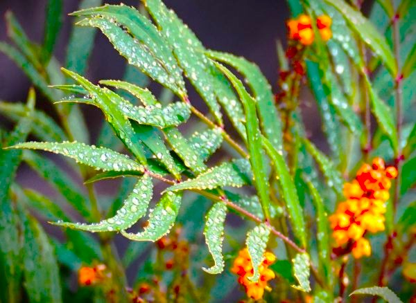 ホソバヒイラギナンテン(細葉柊南天) 葉の上に雫が残り、冬ならではの表情を見せています。