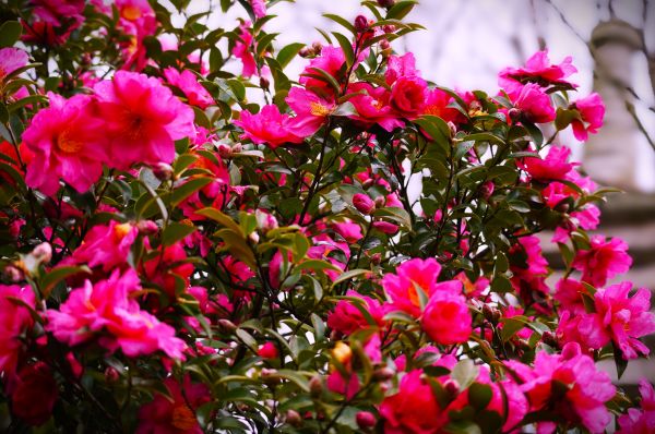 サザンカ(山茶花) ピンク色の花が重なり合い、境内は華やかな雰囲気に包まれています。