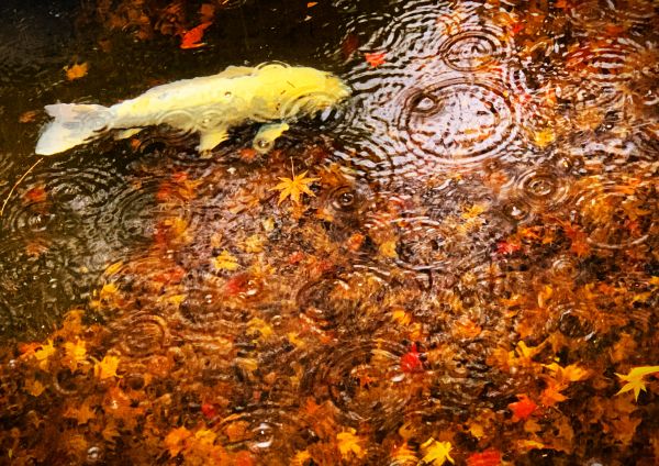 雨が降り水面に丸い波紋が広がる池。散った紅葉の上を鯉がゆったりと泳ぎ、冬の静かな趣を演出しています。
