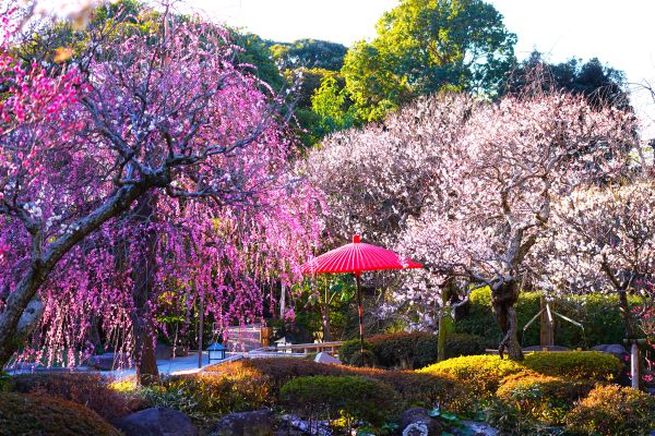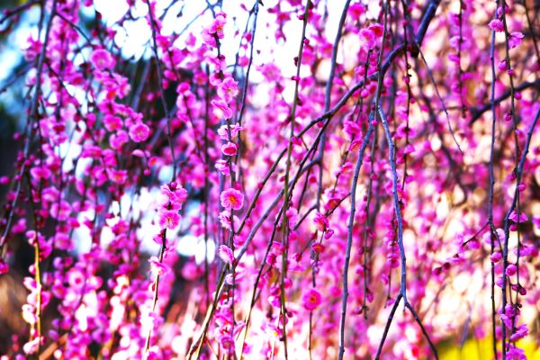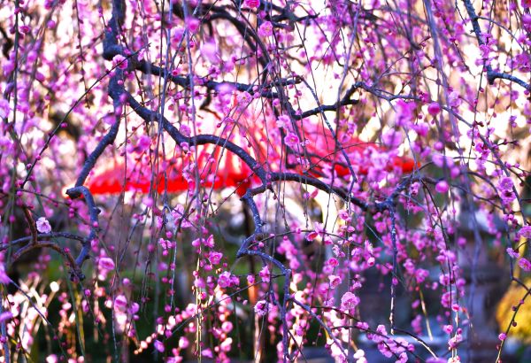 枝垂れる紅梅が風に揺れながら咲き誇り、淡い桃色のカーテンのように境内を彩っています。