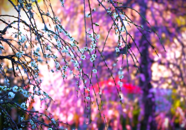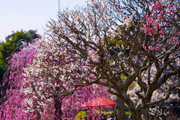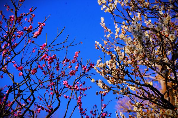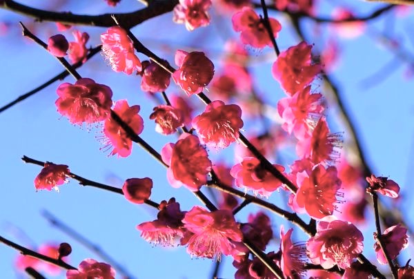 コウバイ(紅梅)に囲まれるメジロ。早春ならではの風情が広がります。