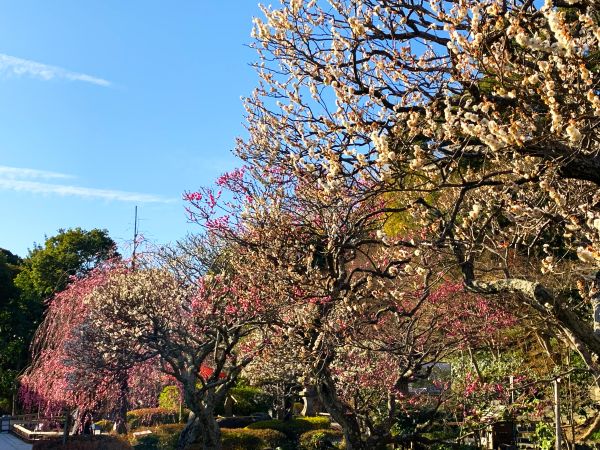 梅の花が重なり合い、境内に早春の華やぎを添えています。