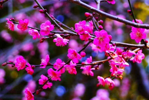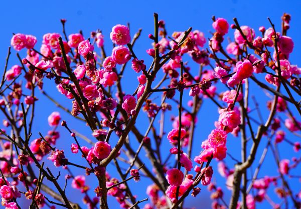 ベニチドリ(紅千鳥) 鮮やかな紅色の花を咲かせる一重咲きの梅です。花びらの形がすっきりとしており、軽やかな印象を与えます。