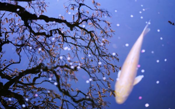 満開の梅を映す水面と白い鯉が織りなす、春のひとこま。