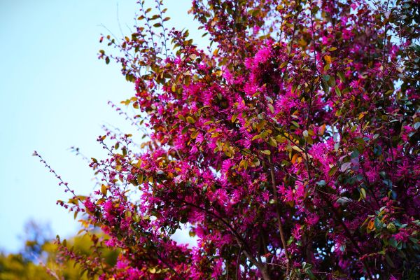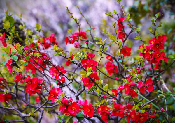 細長いリボンのような花びらが特徴の花木です。鮮やかな紅色の花が枝いっぱいに咲き、ひときわ目を引く存在です。