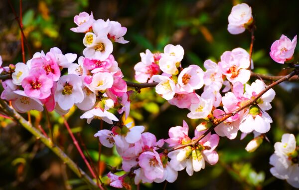 弁天窟前に咲くボケは、ピンクと白の二色の花が可愛らしく華やかな景色となっています。