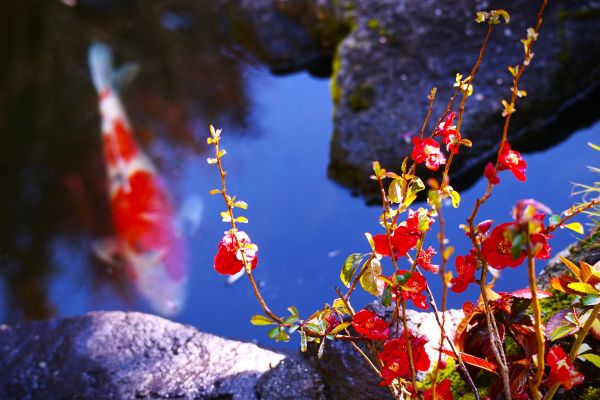 春の水辺に、紅ふたつ。穏やかな境内のひとこまです。