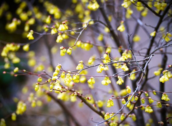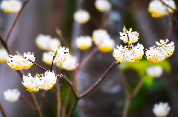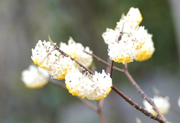 白い丸が浮かぶ無数のミツマタ。光の粒がそっと舞い降りたような、可愛らしい春の風景です。