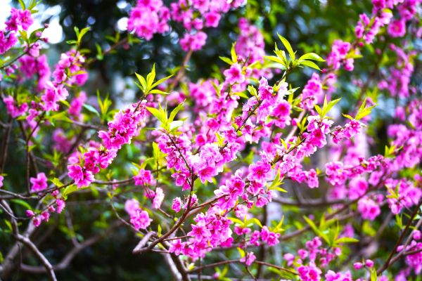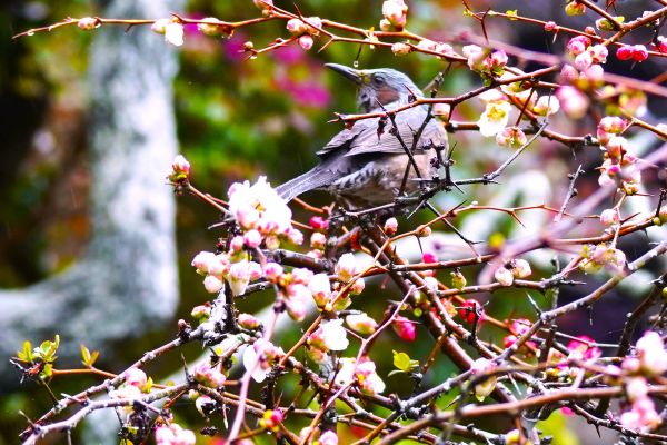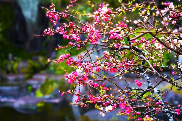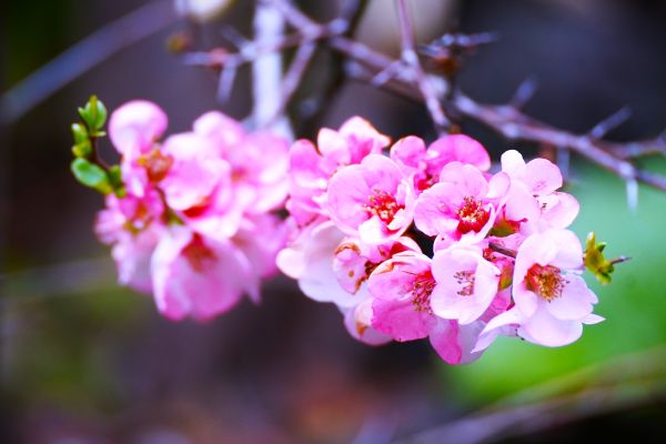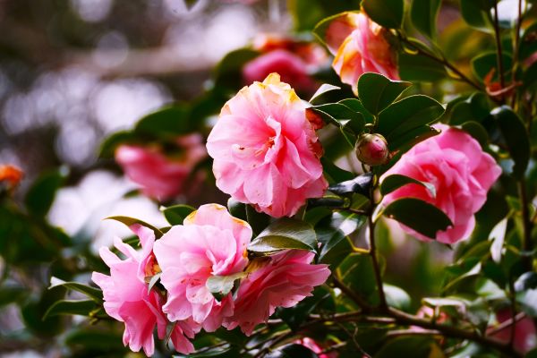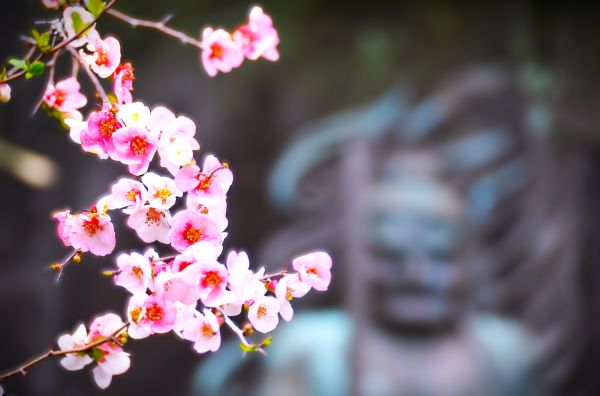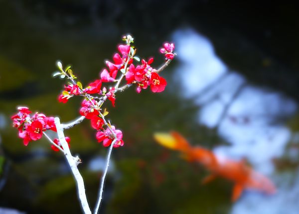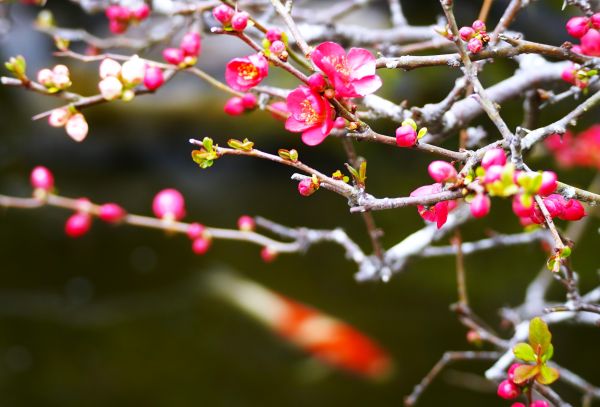 境内に咲く赤と桃色のボケの花。色の違いを比べながら、お楽しみいただけます。