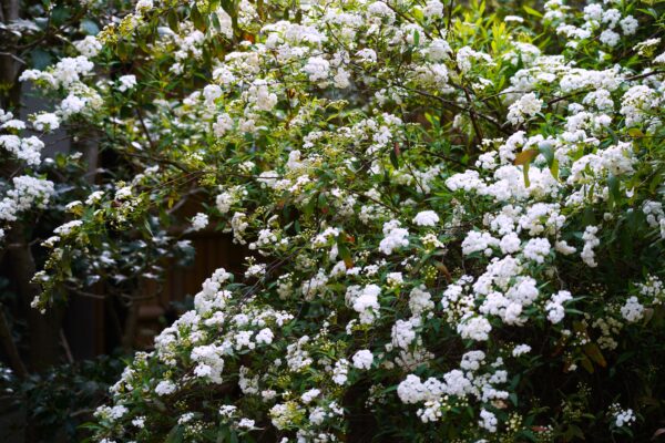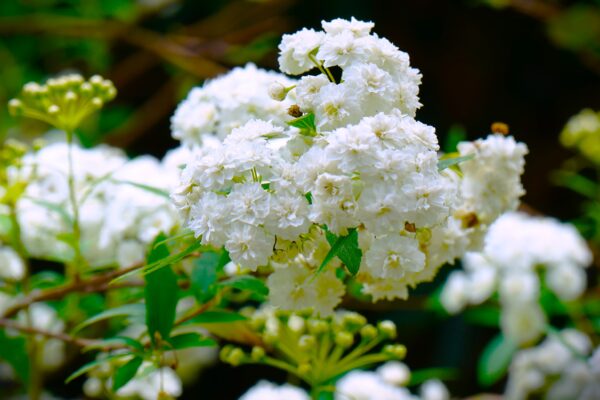 小さな白い花が枝先に無数に集まり、ふんわりとした房のように咲くのが特徴です。一つ一つは小さな花ですが重なり合うことで、やわらかな白い彩りをつくり出しています。