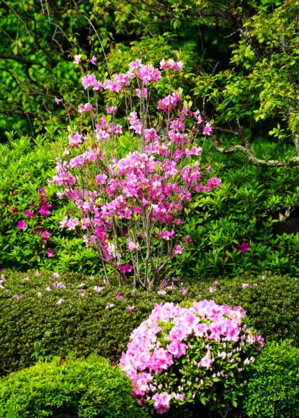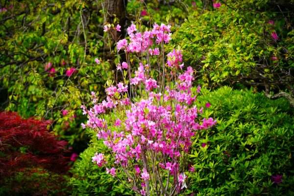 この細長いツツジは「かまくらつつじ」とも呼ばれるツツジで、山に自生するツツジに近い自然な姿が魅力です。細く伸びる枝先に、やわらかなピンクの花を咲かせます。