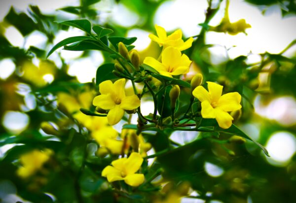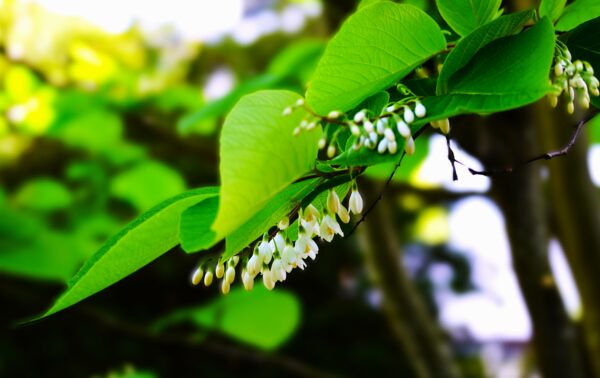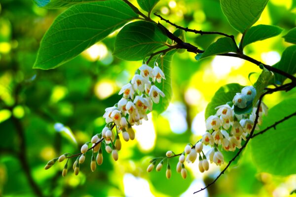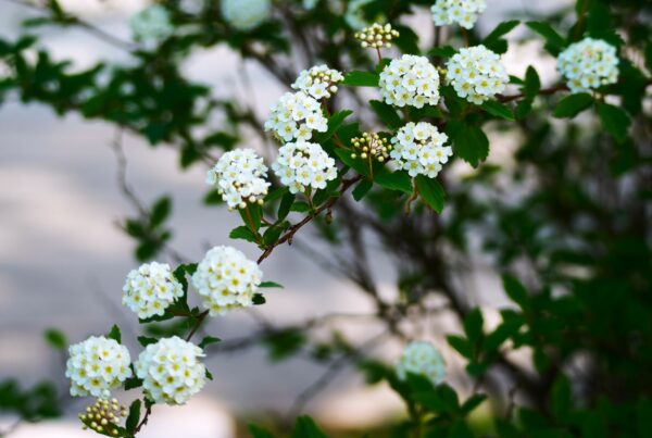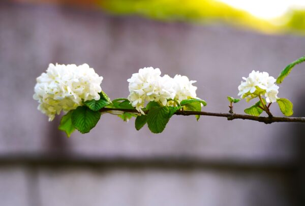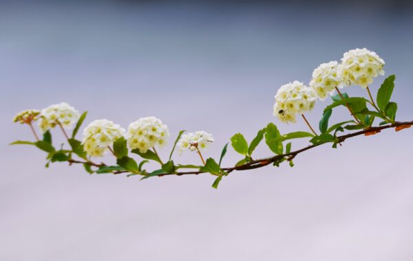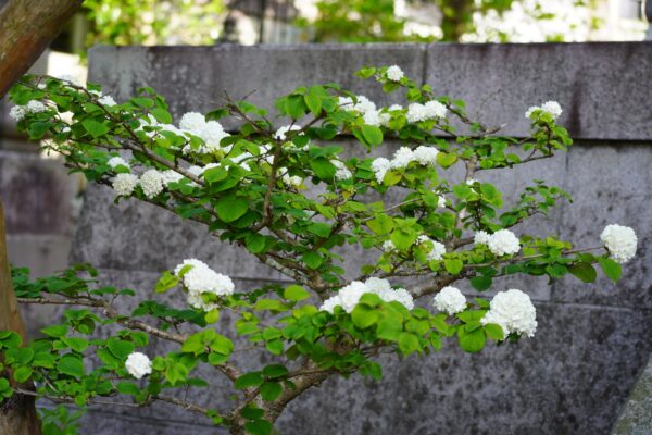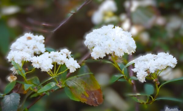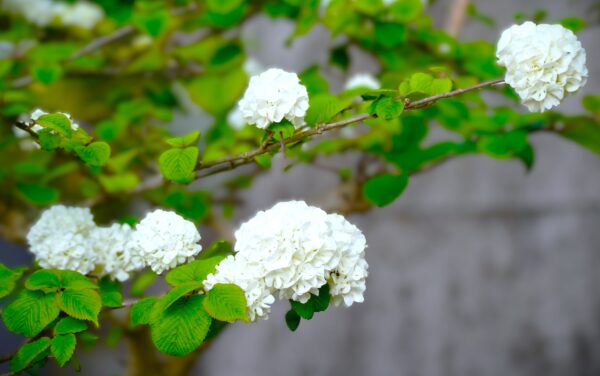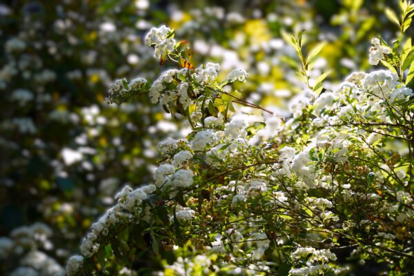 コデマリは、小さな白い花が枝先に寄り添うように咲き、ふんわりとした丸い姿をつくります。