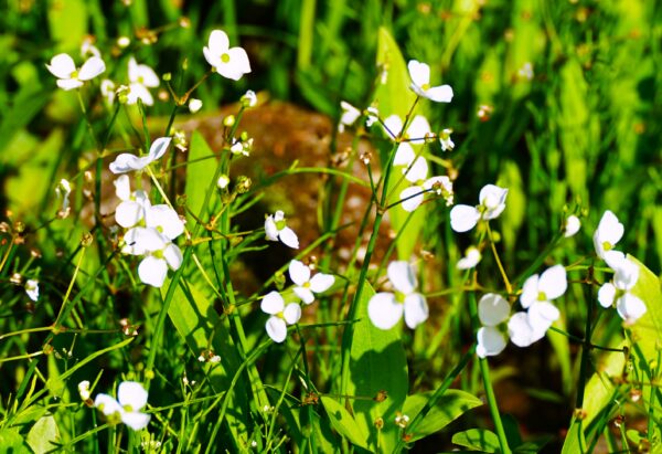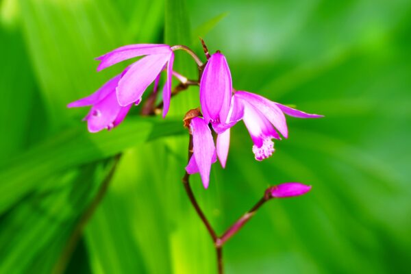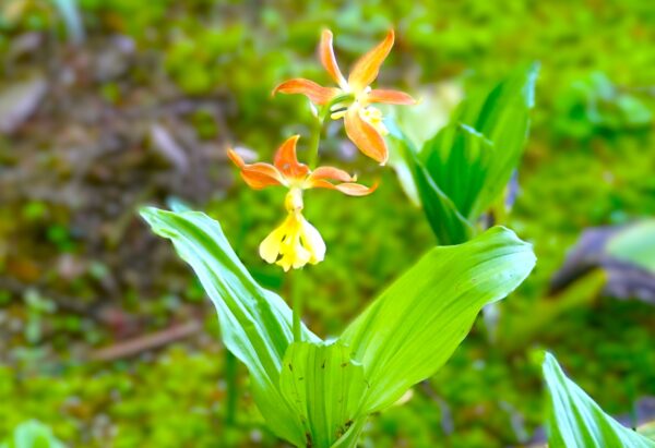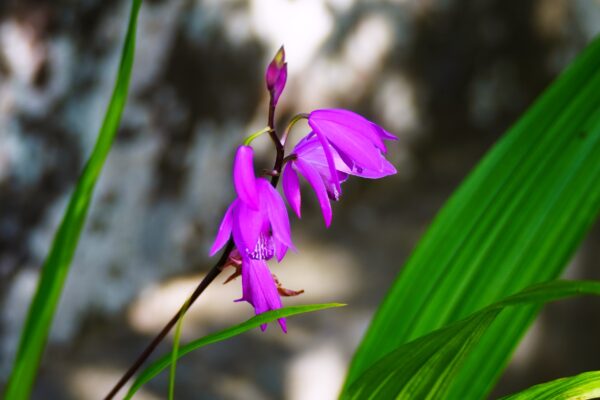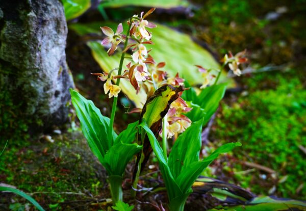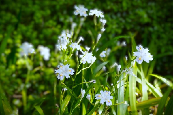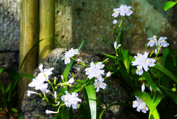 木陰のような半日陰の場所に咲くアヤメ科の花で、白い花びらに紫の文様をまとったような清らかな姿を見せます。