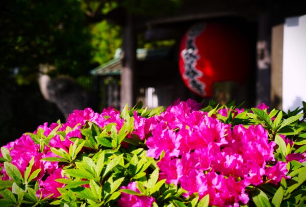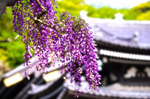 風に揺れるフジの花房が、境内に初夏の気配を運んでいます。