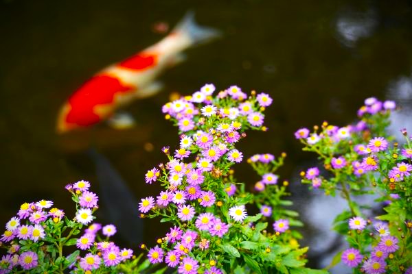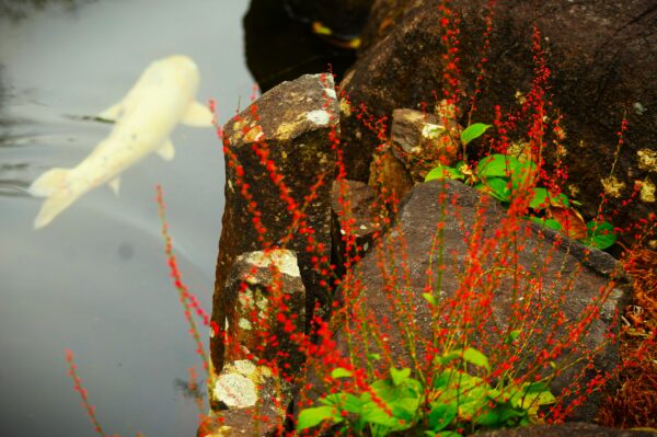ミズヒキ(水引) 赤いミズヒキと白い鯉。赤と白が出会う縁起の良い一瞬です。