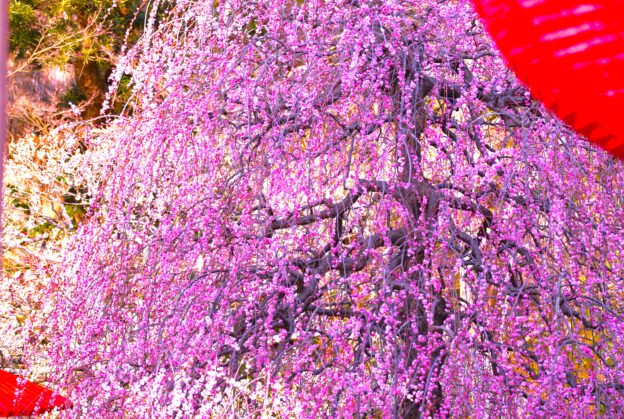 枝垂れる紅梅が風に揺れながら咲き誇り、淡い桃色のカーテンのように境内を彩っています。