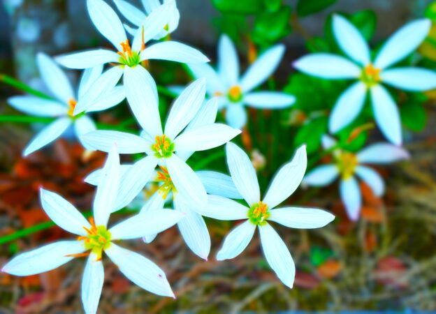 花は6枚の花弁が放射状に広がり、まるで小さな星のような形が特徴です。